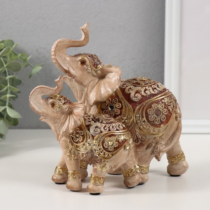 Сувенир полистоун "Слон со слонёнком, цветы и узоры на попоне" золото и беж 15,5х10х16 см
