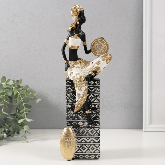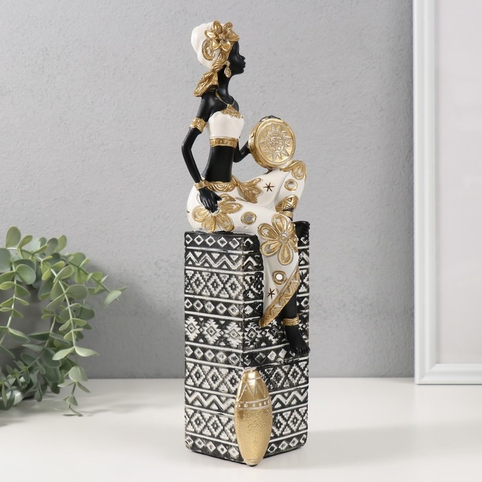 Сувенир полистоун "Африканка с бубном на колонне с узорами" бело-черный, золото 10,5х9х32 см 10325