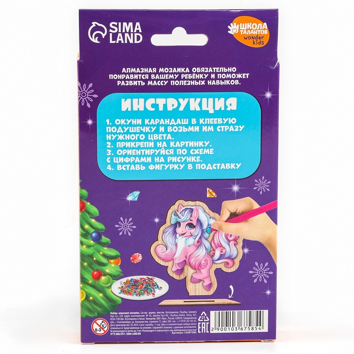 Алмазная мозаика для детей на деревянной фигурке «Единорожка», 10 х 10 см, новогодний набор для творчества