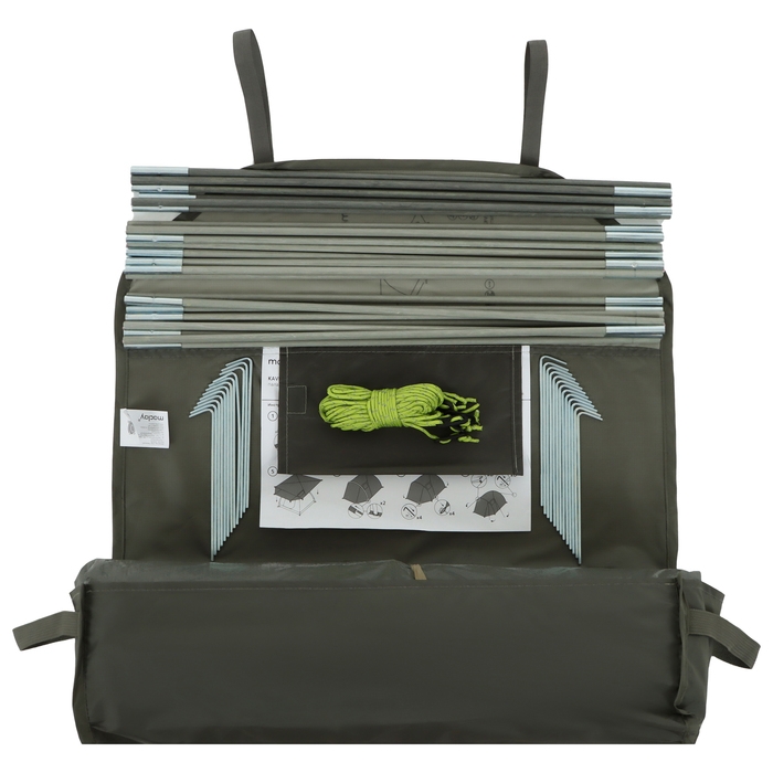 - Тент выполнен из прочного полиэстера с добавлением рипстопа, устойчивого к разрывам и растяжениям.