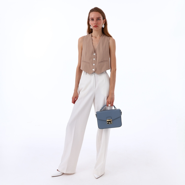 Сумка оснащена клапаном и металлической фурнитурой золотого цвета, что придаёт ей завершённый и элегантный вид. Внутри предусмотрен один удобный карман, куда можно положить самые необходимые вещи.