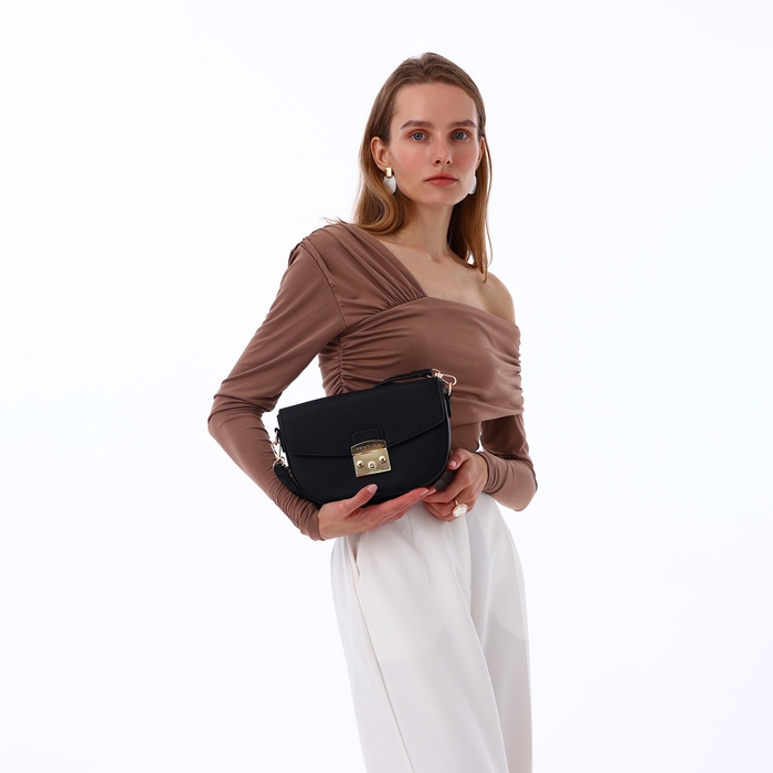 Сумка оснащена клапаном и металлической фурнитурой золотого цвета, что придаёт ей завершённый и элегантный вид. Внутри предусмотрен один удобный карман, куда можно положить самые необходимые вещи.