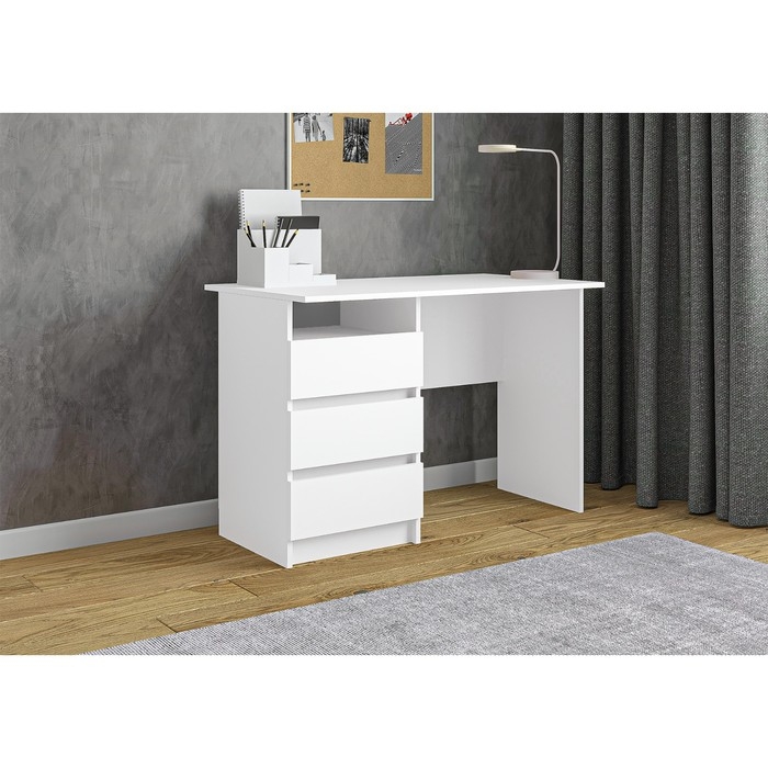 Cтол письменный с ящиками Зара - идеальное решение для тех, кто ценит стиль, функциональность и качество. Сочетает в себе преимущества просторного письменного стола, вместительной тумбы с открытой полкой и 3 выдвижными ящиками, превращаясь тем самым в полноценное рабочее место в офисе или функциональное место для школьника в детской комнате. На столе хватит места для ноутбука и компьютера, а открытую полку и ящики можно использовать для книг, канцелярии или документов. Письменный стол Зара с ящиками выполнен без ручек и лицевой фурнитуры. Стильные белые матовые фасады идеально впишутся в помещение в современном, лофт или скандинавском стиле.