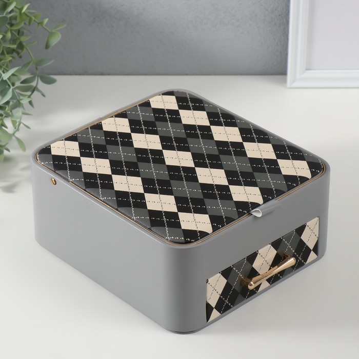 Шкатулка кожзам для украшений "Клетка" серая 20х22,5х9,5 см