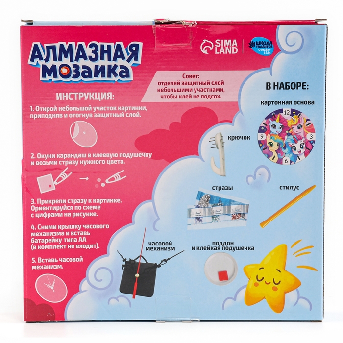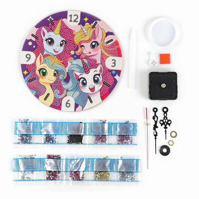 Ребёнку предстоит разложить кристаллики карандашом по пронумерованной схеме, заполнив всё полотно. Часики с клеевым покрытием будут надёжно удерживать стразы.