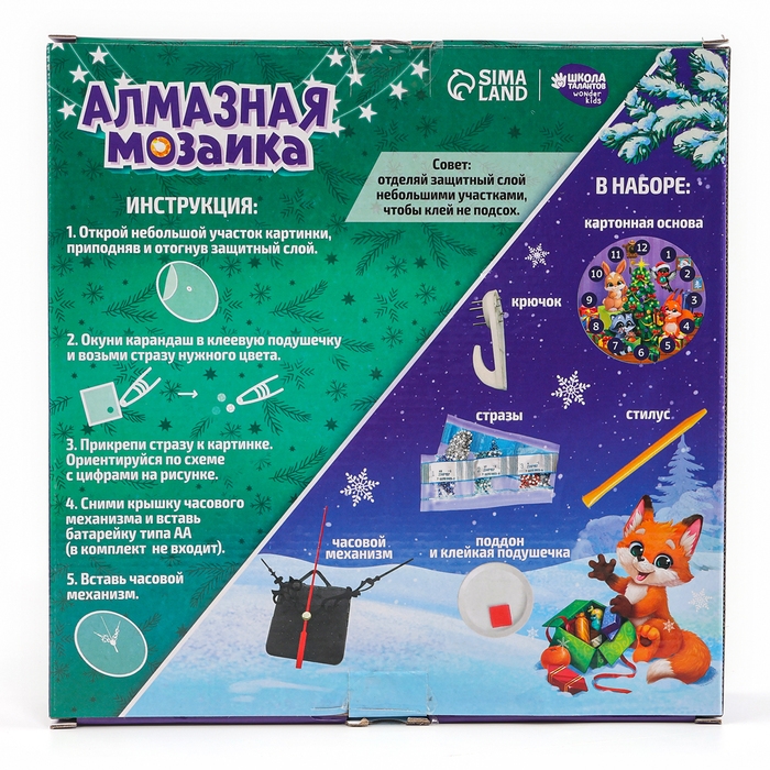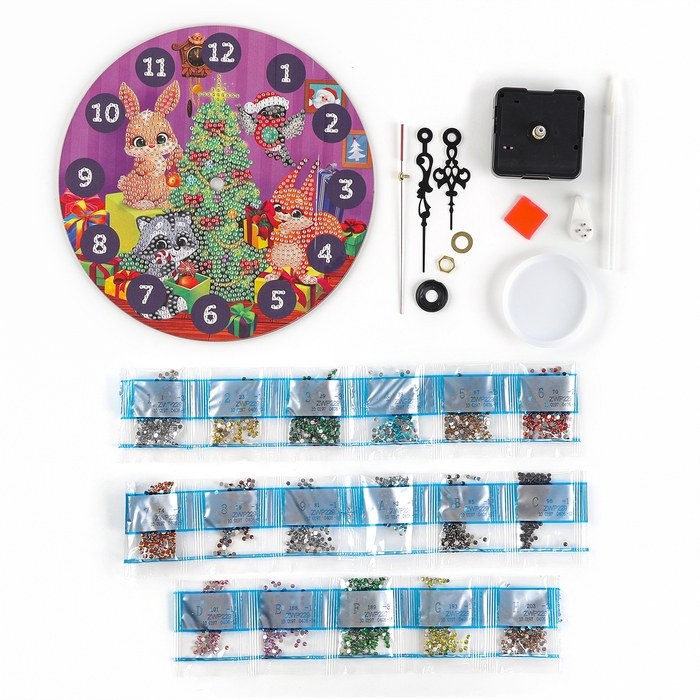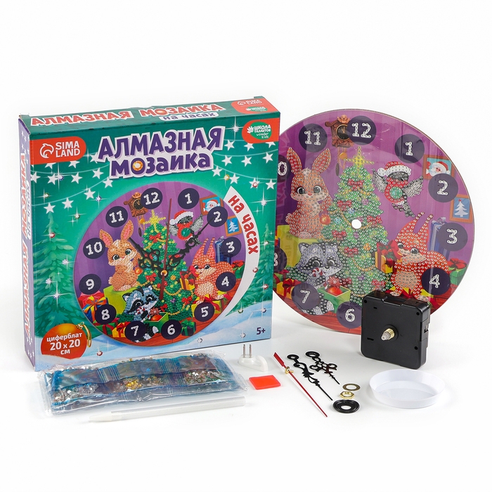 Алмазная мозаика на новый год для детей с частичным заполнением на часах «Лесные зверята», 20 х 20 см, новогодний набор для творчества