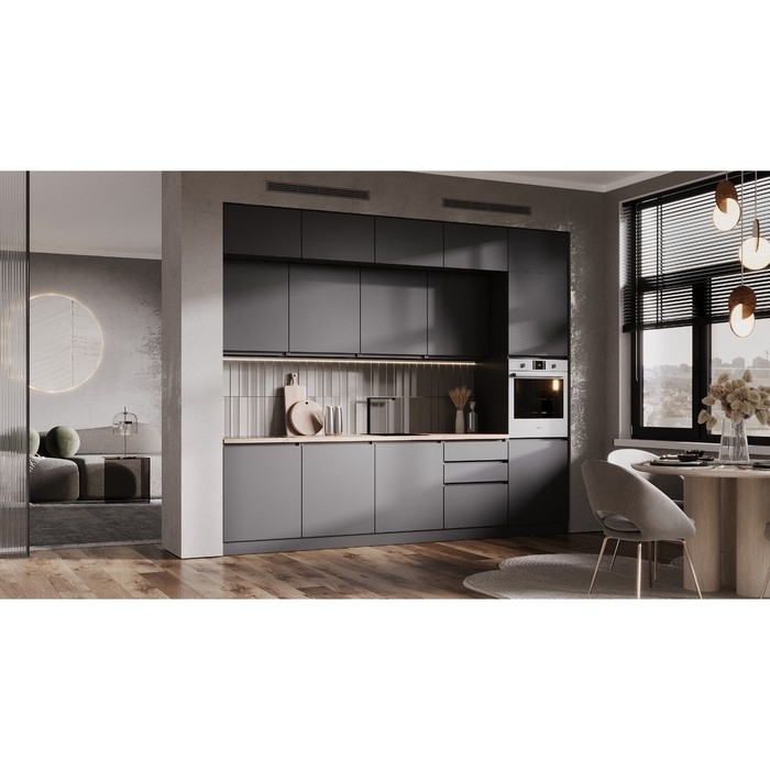Кухонный гарнитур в потолок 3000 Виктория, Графит - идеальное решение для тех, кто ценит стиль, функциональность и качество. Он отлично впишется в ваш интерьер, максимально обеспечивая при этом удобство и эстетичность. Все шкафы крепятся отдельно, модули можно менять местами. Особенностями данного гарнитура является фасад без ручек, предусмотрена ниша для удобного захвата фасада. В комплекте вся необходимая фурнитура для сборки кухонного гарнитура.