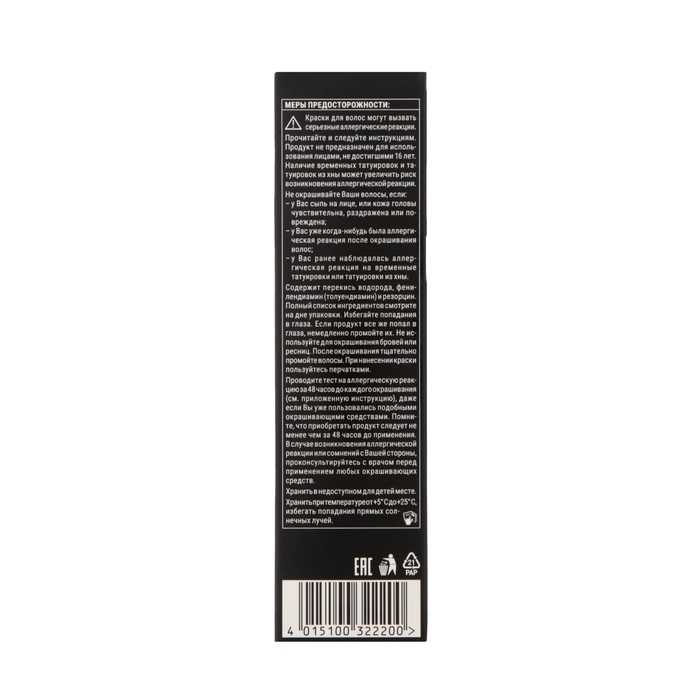 - Проявляющее молочко: Aqua (Water, Eau), Paraffinum Liquidum (Mineral Oil, Huile Minérale), Hydrogen Peroxide, Cetearyl Alcohol, PEG-40 Castor Oil, Sodium Cetearyl Sulfate, Etidronic Acid, Potassium Hydroxide, 2,6-Dicarboxypyridine, Disodium Pyrophosphate, Sodium Benzoate, Sodium Sulfate