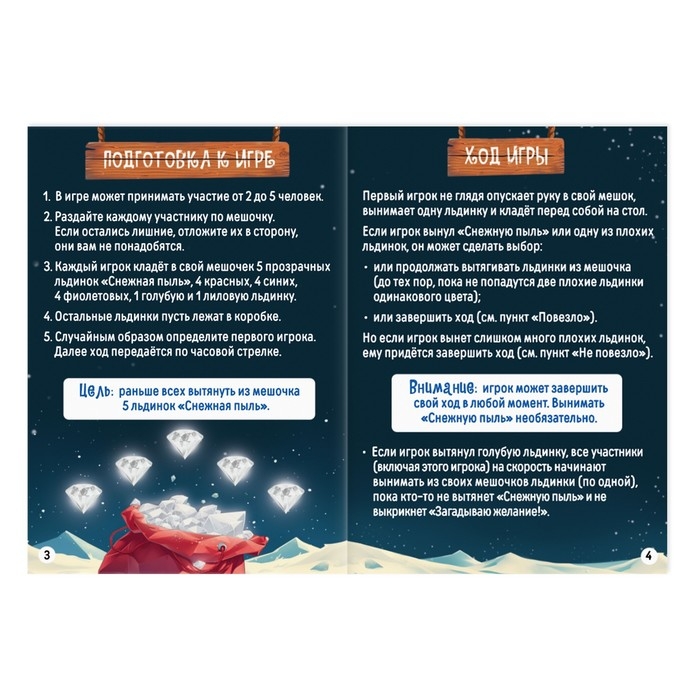 Вы случайно оказались в пещере, полной чудес. Ходят легенды, что тот, кто найдет 5 льдинок «Снежная пыль», сможет исполнить свое самое заветное желание! Только в пещере есть и плохие льдинки, которые вам совсем не нужны… Вытягивайте из мешков ценные льдинки, подбрасывайте другим участникам плохие и постарайтесь набрать как можно больше снежной пыли!