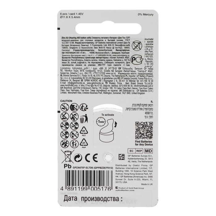 Батарейка цинковая GP, ZA675 (PR44)-6BL, для слуховых аппаратов, 1.45В, блистер, 6 шт.