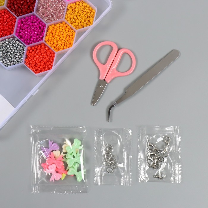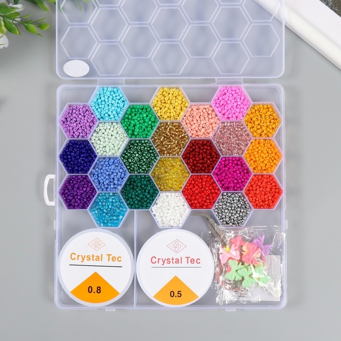Бисер стекло 8/0, 12/0 в шкатулке "Осень" бусины, эласт. нить, ножницы, пинцет 20х20х1,8 см 102431