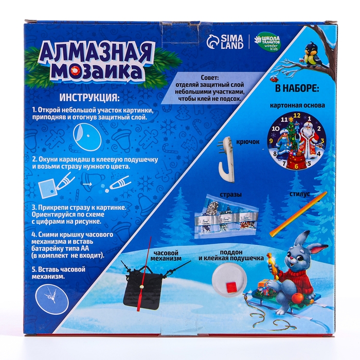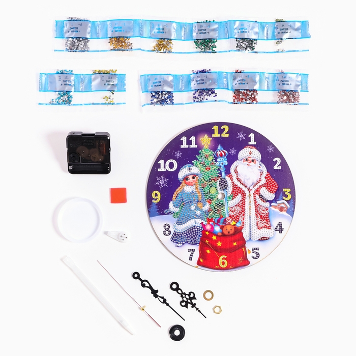 Ребёнку предстоит разложить кристаллики карандашом по пронумерованной схеме, заполнив всё полотно. Часики с клеевым покрытием будут надёжно удерживать стразы.