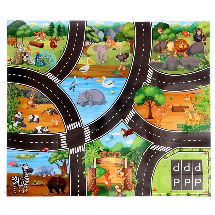- Коврик размером 70 × 80 см украшен изображениями животных и зоопарка, что создаёт реалистичную игровую среду.