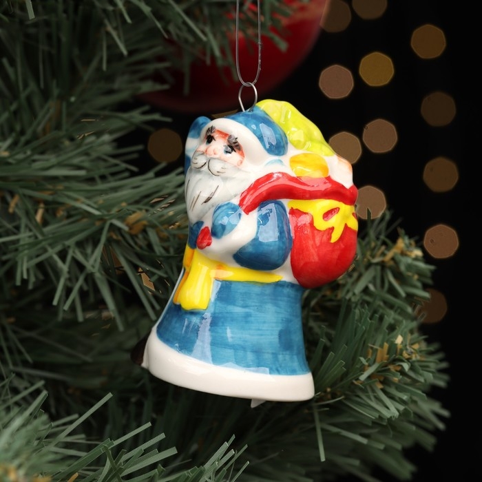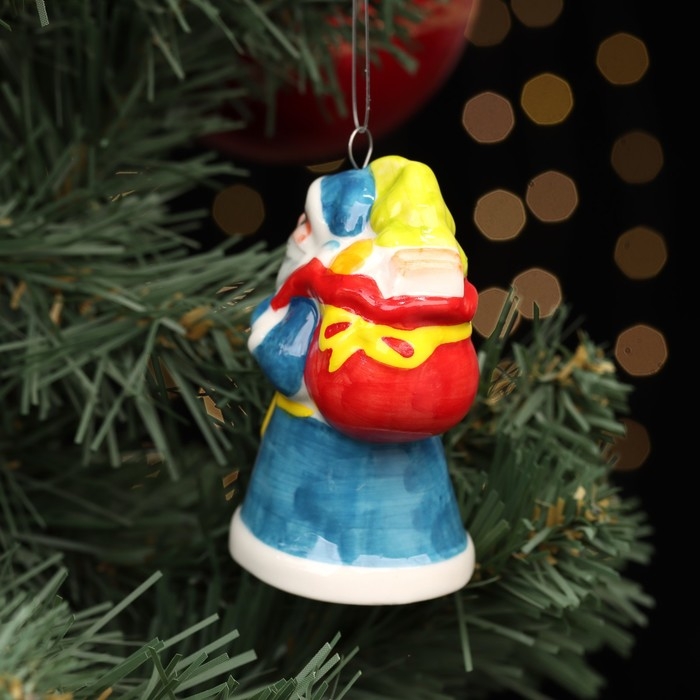 Ёлочная фарфоровая игрушка "Дед Мороз, мешок с подарками", синяя шуба, 8 см