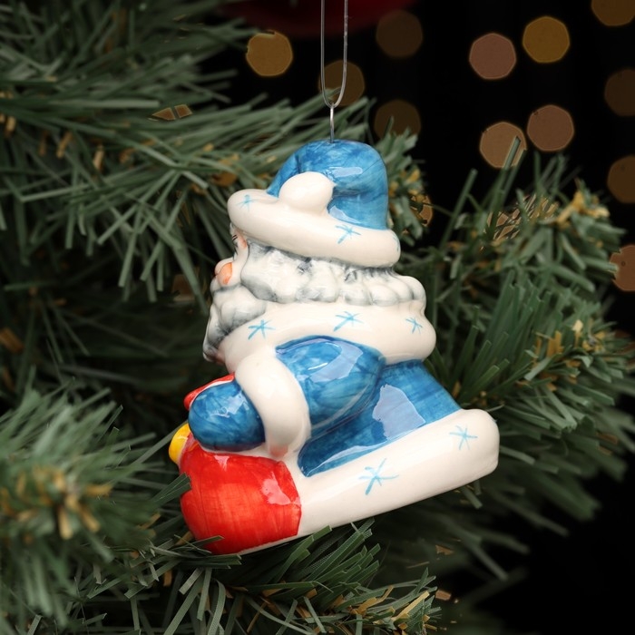 Ёлочная фарфоровая игрушка "Дед Мороз с часами", голубая шуба, 8 см