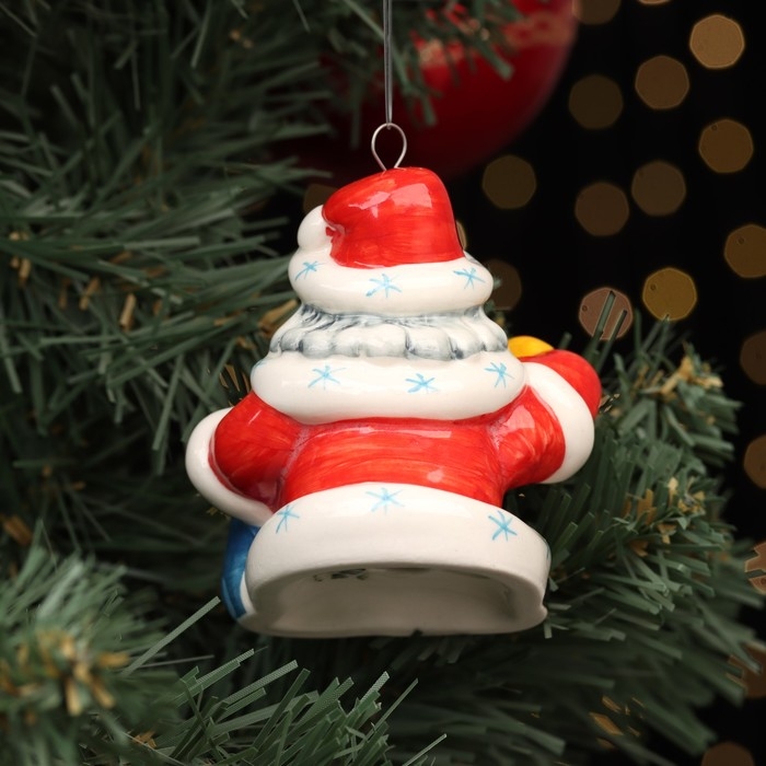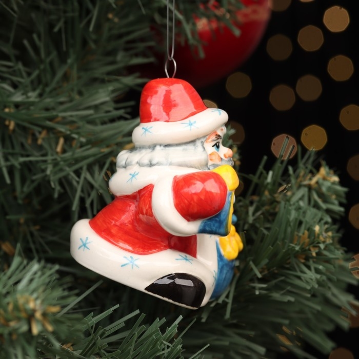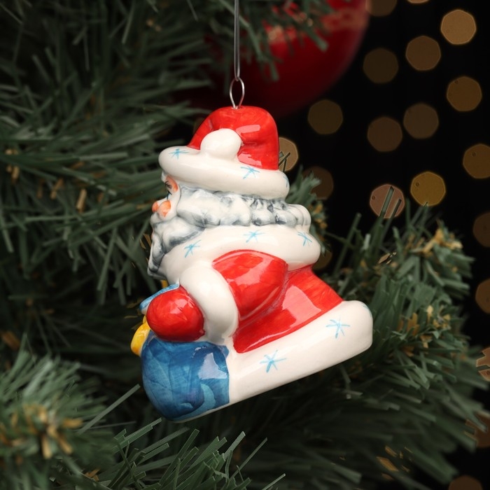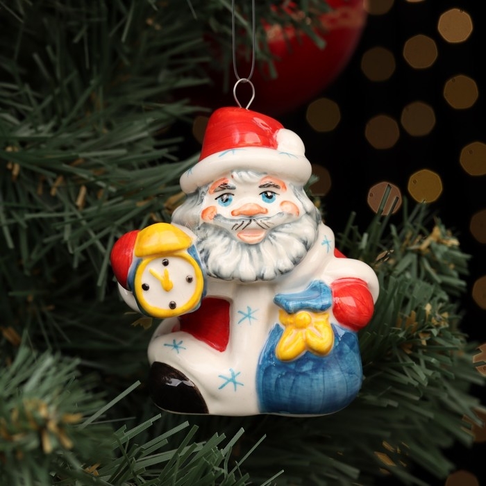 Ёлочная фарфоровая игрушка "Дед Мороз с часами", красная шуба, 8 см