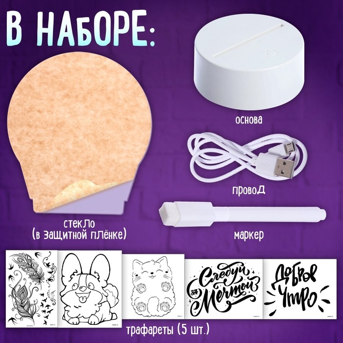 Набор для творчества «Чудесный ночник» — это уникальный набор для детей от 5 лет, который помогает развивать креативные навыки и фантазию. С помощью этого ночника ребёнок сможет создавать свои световые композиции, используя трафареты с милыми животными и разными надписями.