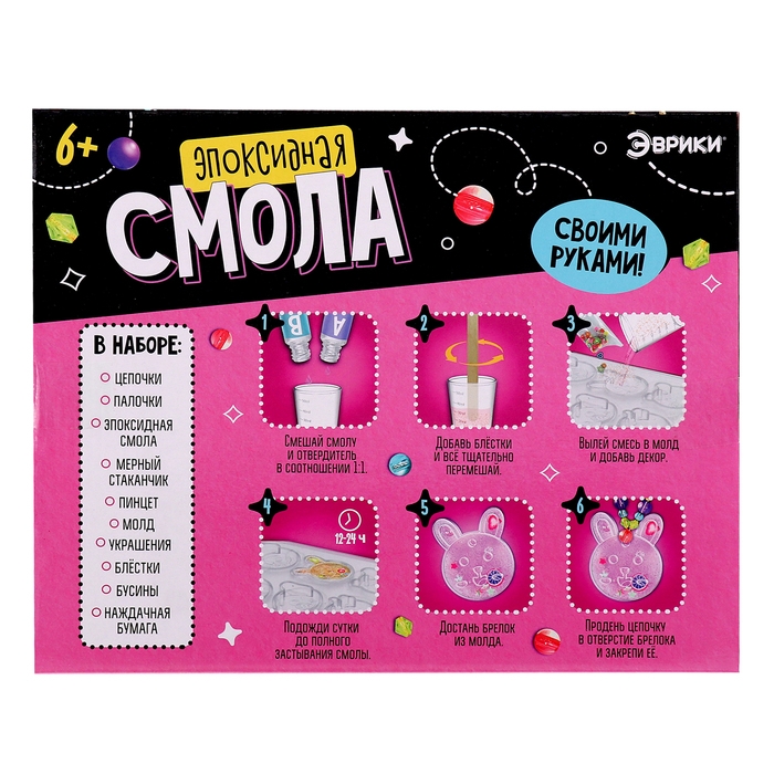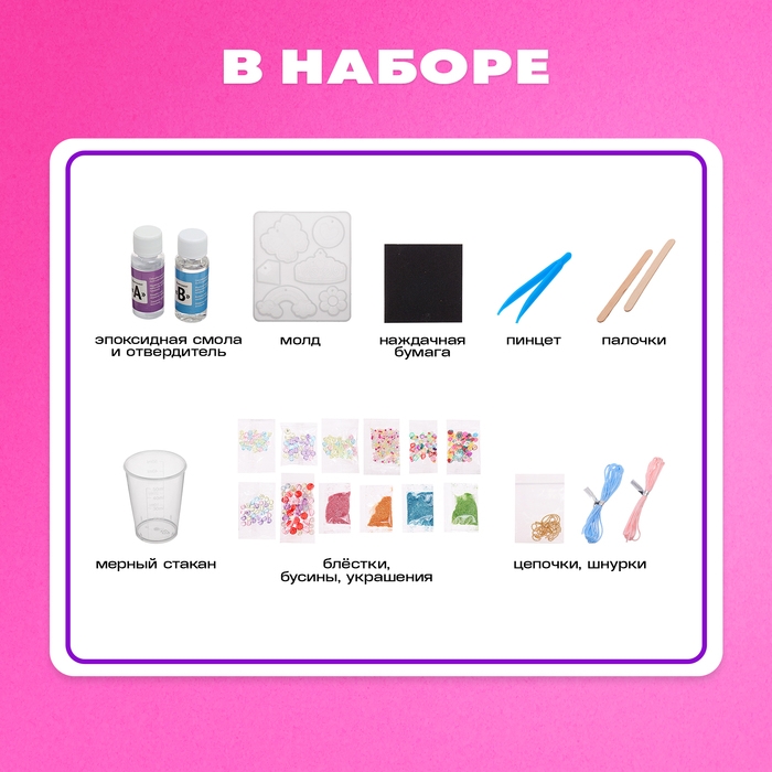 Набор для опытов «Эпоксидная смола» — идеальное решение для занятия творчеством! Ребёнок проведёт увлекательный эксперимент и создаст уникальные украшения из эпоксидной смолы!