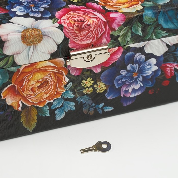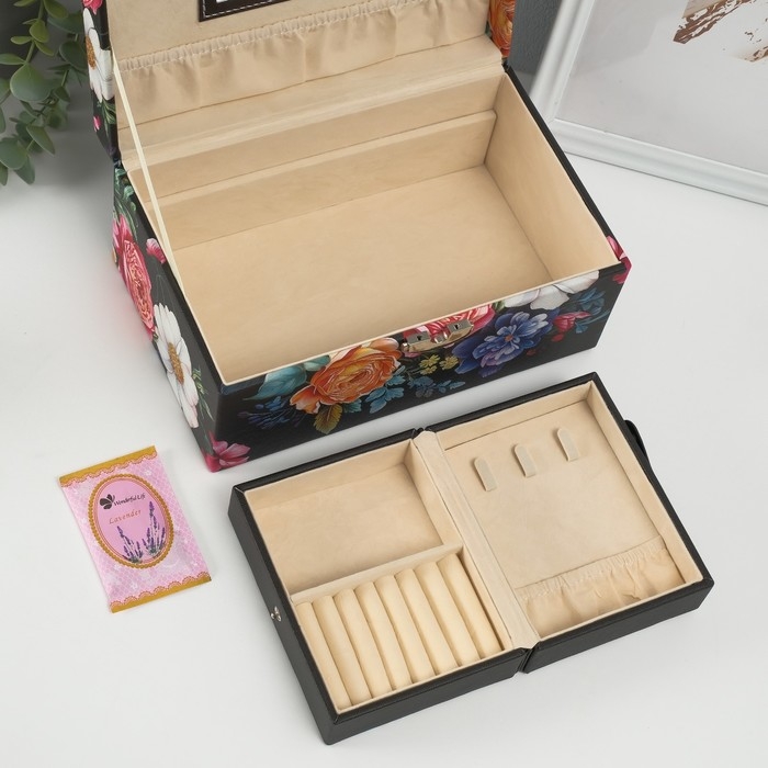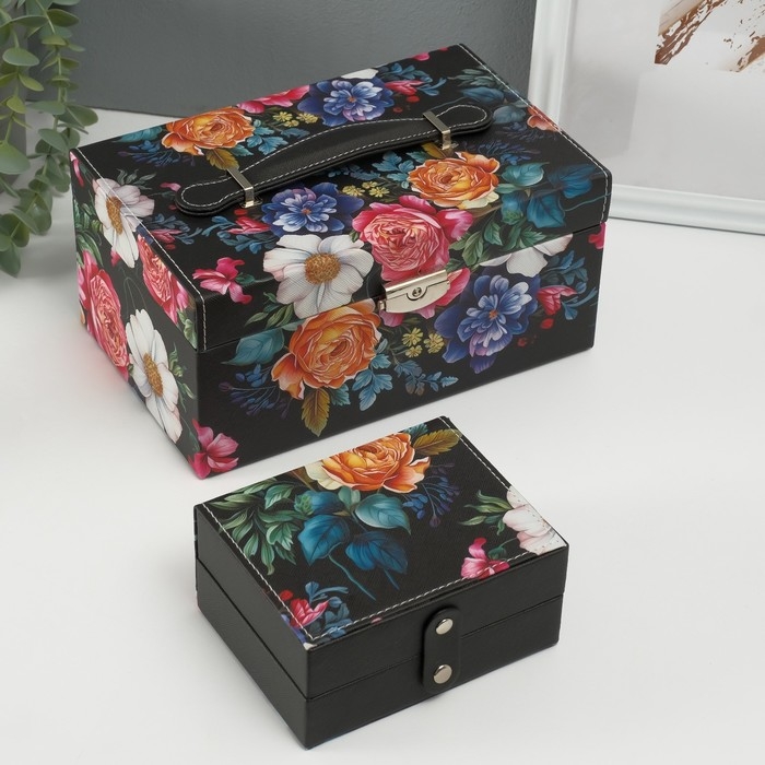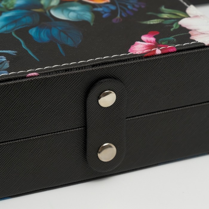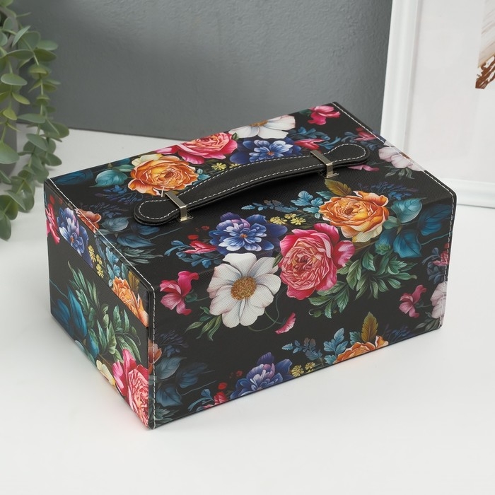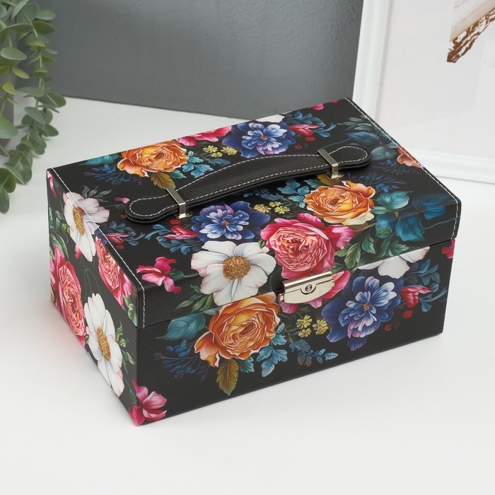 Шкатулка кожзам для украшений сундук "Винтажный букет на чёрном" 24х15х12 см