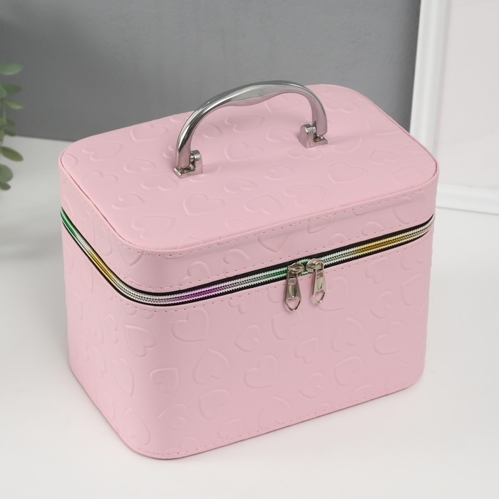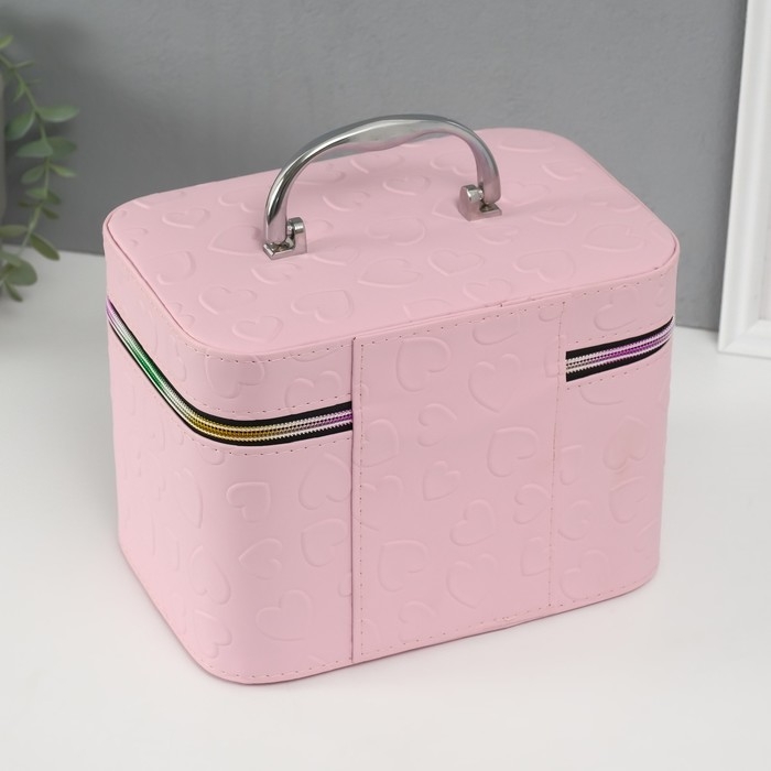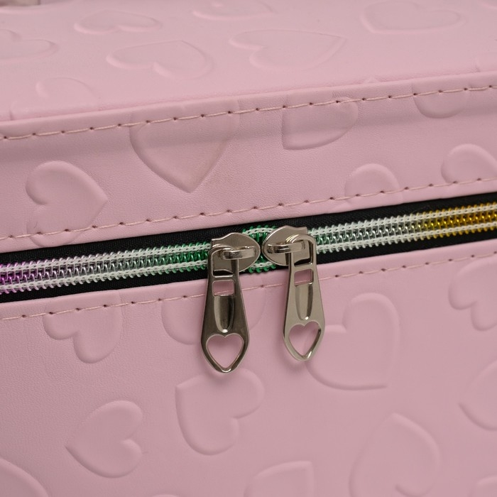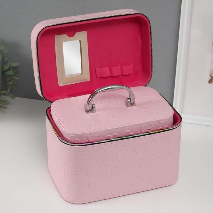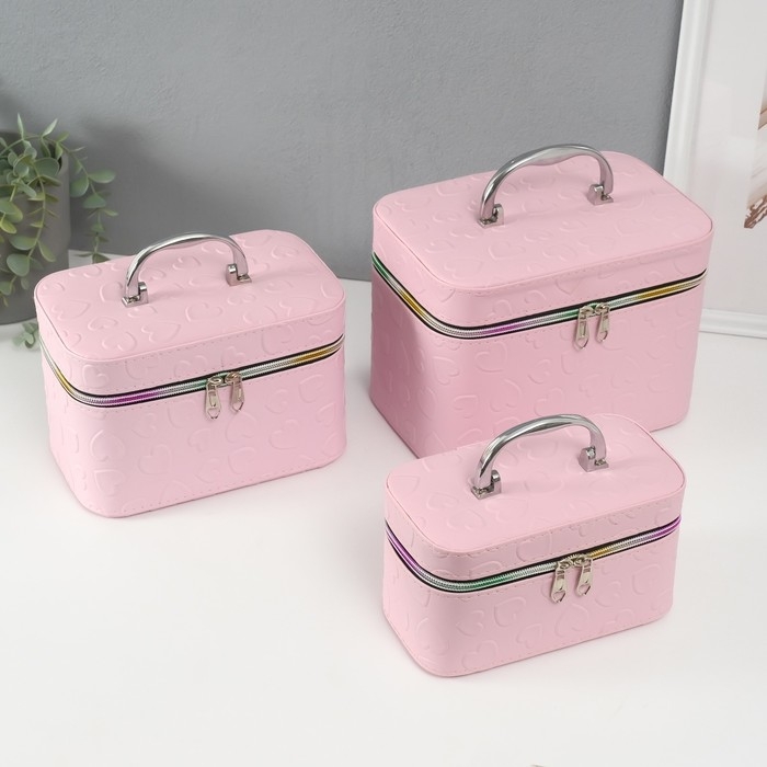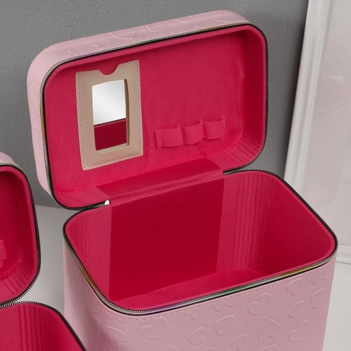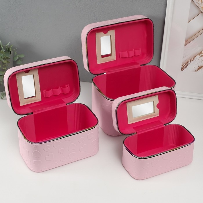 Шкатулка кожзам с зеркалом "Сердца" св-розовая набор 3 шт 19х10,5х10,5 21х13х14 15х23х17 см