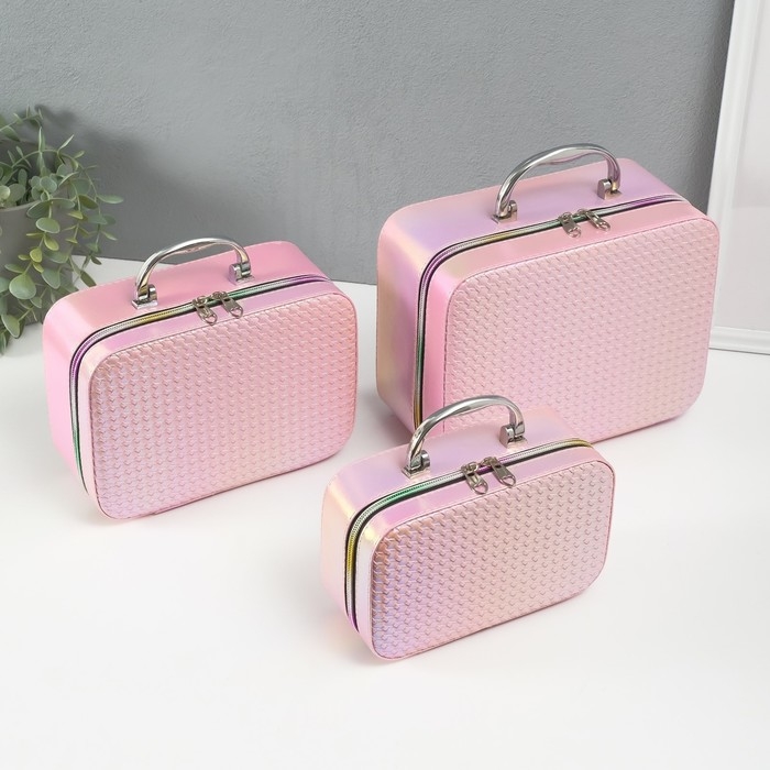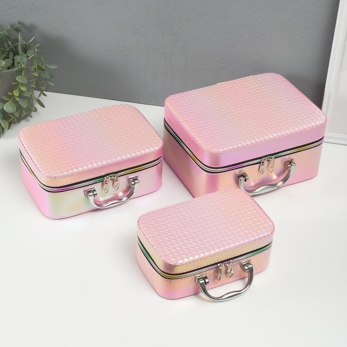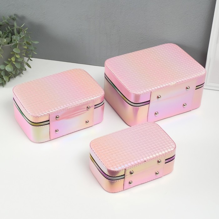 Шкатулка кожзам с зеркалом "Плетение" розовая н-р 3 шт 19,4х12,5х8 22х16х9 11,5х24,5х18,5 см
