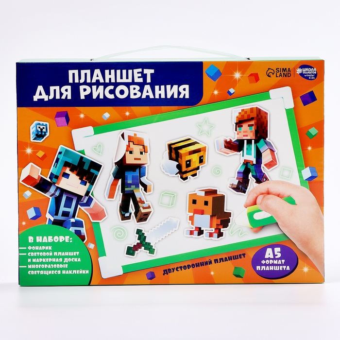 С помощью такой доски кроха сможет опробовать рисование светом. Для этого поместите планшет в тёмное место, удерживайте кнопку на маркере и ведите по поверхности. Ребёнок может использовать трафарет или придумать собственные сюжеты. Чем ближе вы держите маркер к планшету, тем ярче будет изображение.