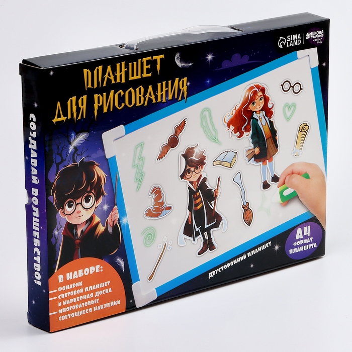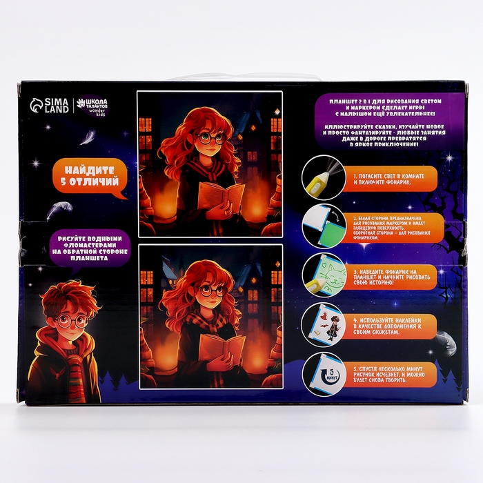 С помощью такой доски кроха сможет опробовать рисование светом. Для этого поместите планшет в тёмное место, удерживайте кнопку на маркере и ведите по поверхности. Ребёнок может использовать трафарет или придумать собственные сюжеты. Чем ближе вы держите маркер к планшету, тем ярче будет изображение.