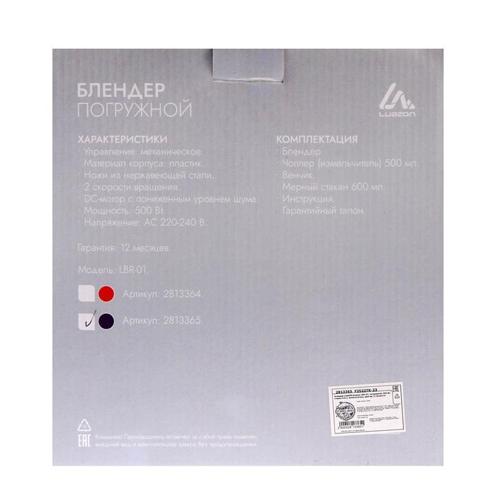Блендер Luazon LBR-01, погружной, 500 Вт, 0.5/0.6 л, 2 скорости, фиолетовый