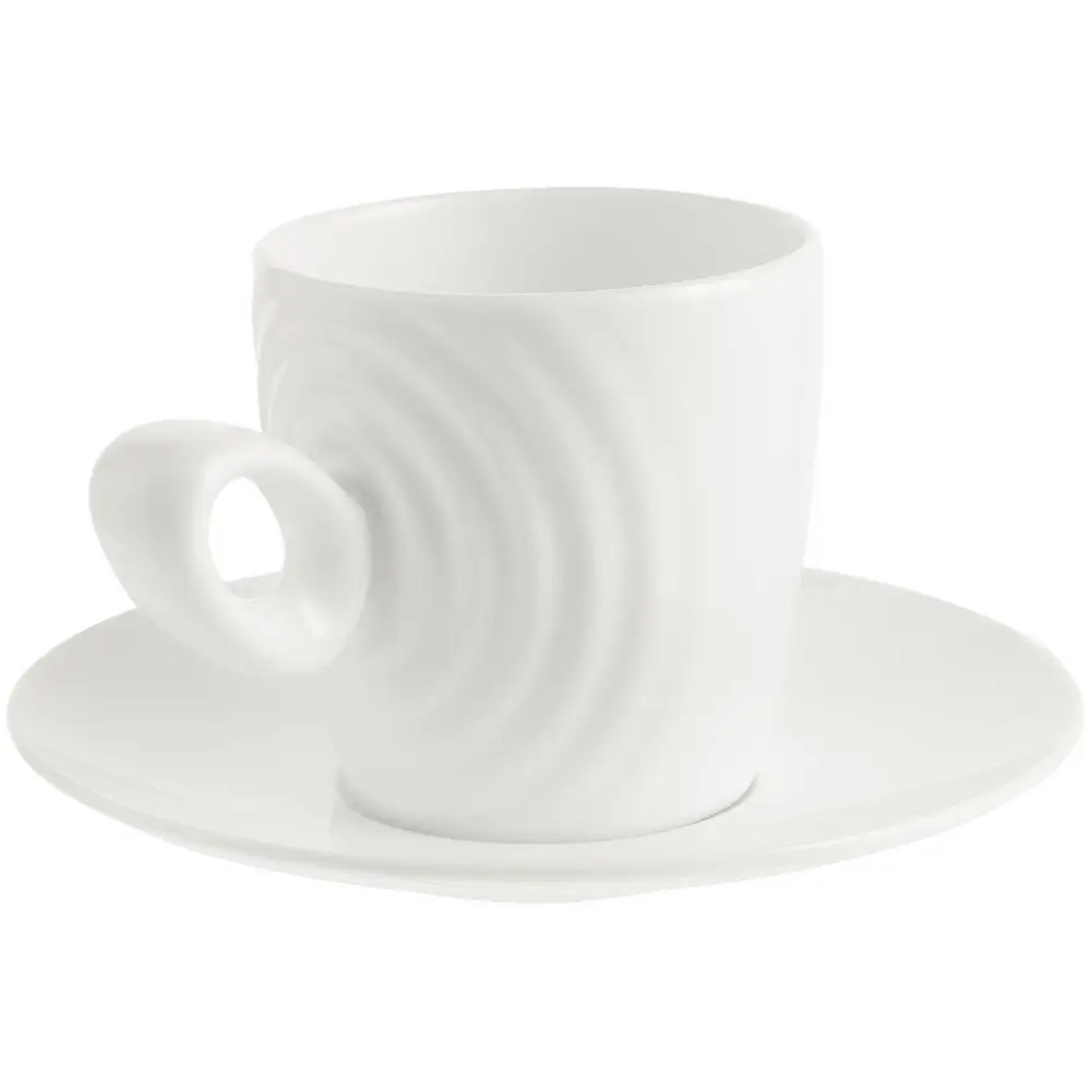 Форма сервиза создана в скульптурной технике: фарфор словно запечатлел сам момент движения. Необычная ручка предметов символизирует камень, от которого появляются завораживающие круги на воде — корпусе изделия.
