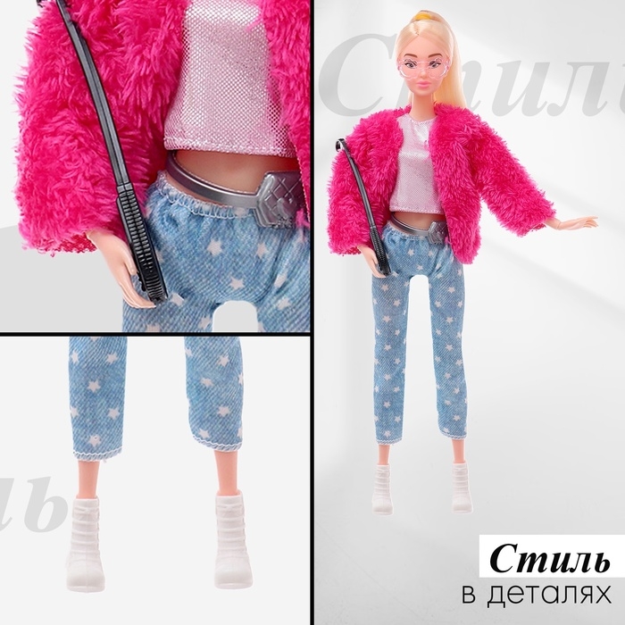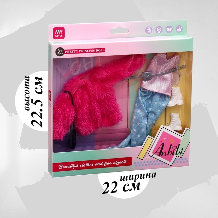 - Кукольный гардероб включает в себя куртку и брюки, с которыми можно легко комбинировать обувь и аксессуары.