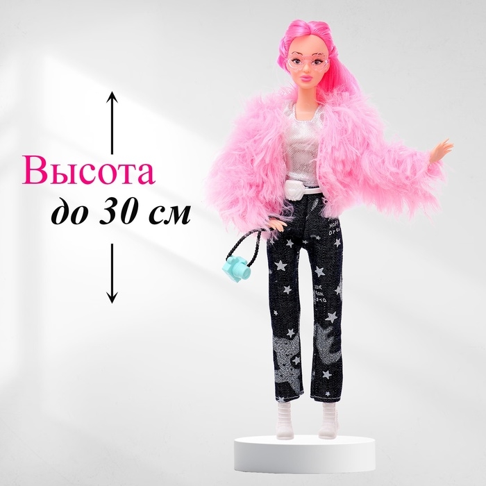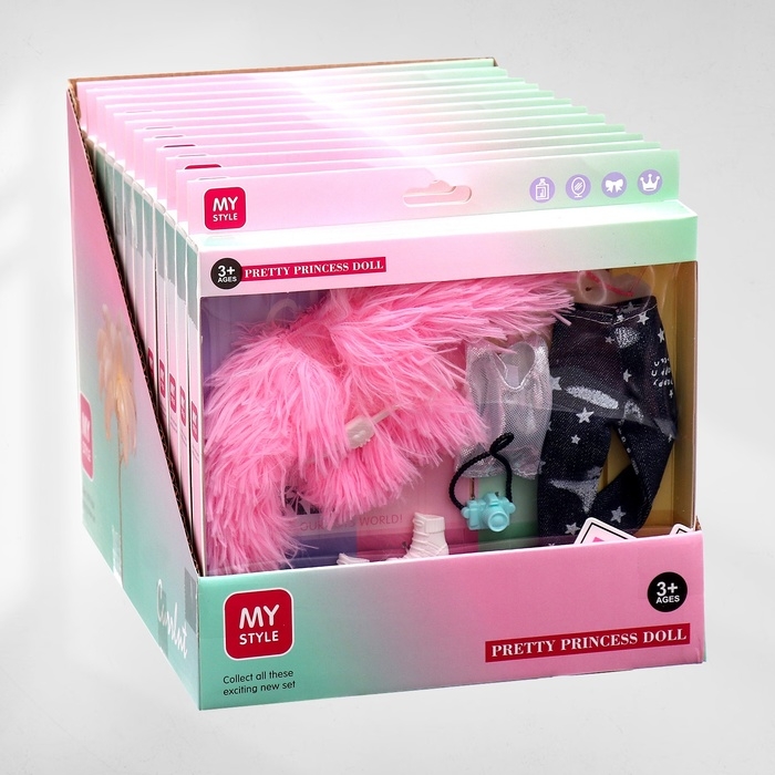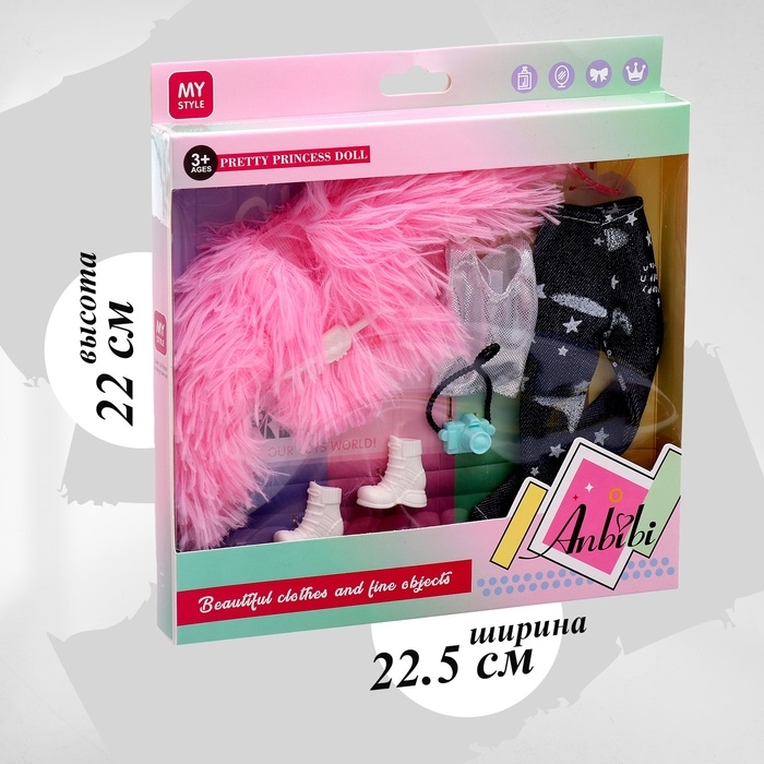 Одежда и аксессуары для куклы - это великолепный набор, который открывает множество возможностей для игры и творчества. Этот набор включает в себя: шубу, топ, брюки, ремень, обувь, фотоаппарат, очки. Предназначенные для кукол ростом до 30 см, эти элементы гардероба позволят создавать разнообразные образы и стили для любимых игрушек.