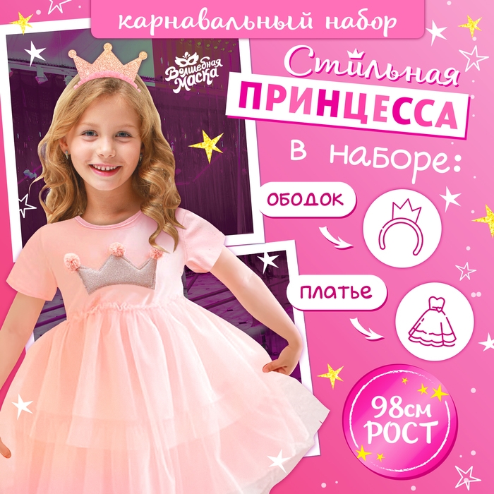 Карнавальный набор «Стильная принцесса»: ободок, платье розовое с короной, рост 98 см