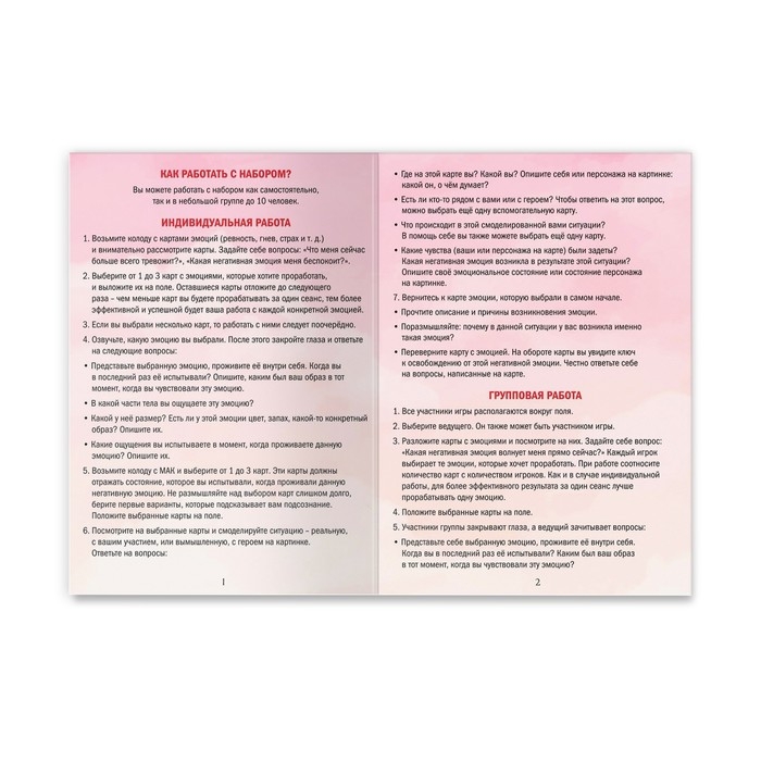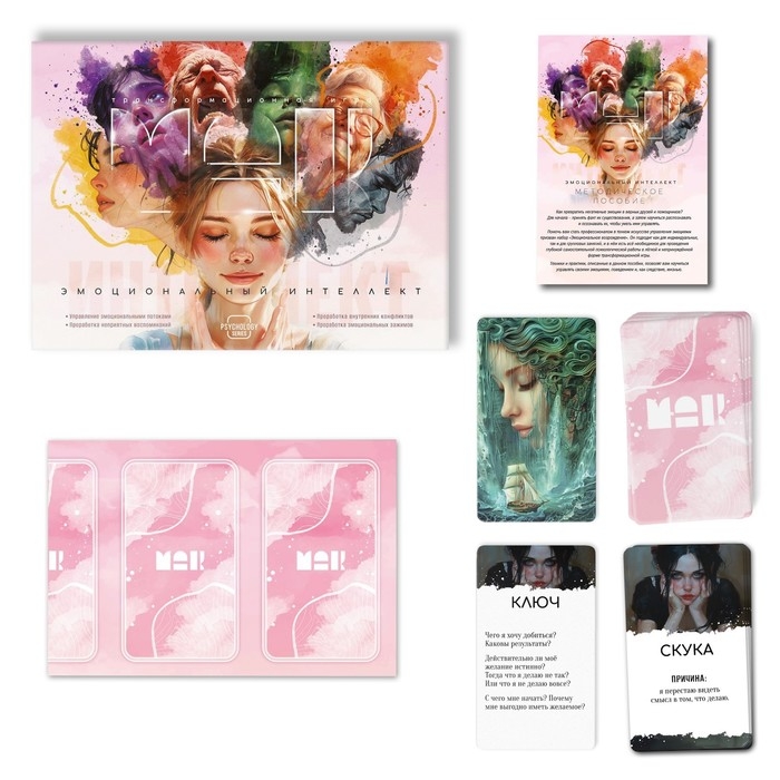 Трансформационная игра «Эмоциональный интеллект» – ваш помощник на пути к саморефлексии и управлению эмоциями. С ней вы научитесь заглядывать внутрь себя и справляться с эмоциональными состояниями. Игра подходит как для профессиональных психологов, так и для тех, кто хочет самостоятельно разобраться с эмоциональным интеллектом.