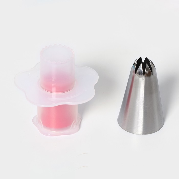 Насадка кондитерская "Закрытая звезда" - это еще один неотъемлемый элемент набора. С помощью этой насадки вы сможете создавать красивые звёздочки и узоры на капкейках, придавая им элегантный вид и добавляя неповторимый шарм.
