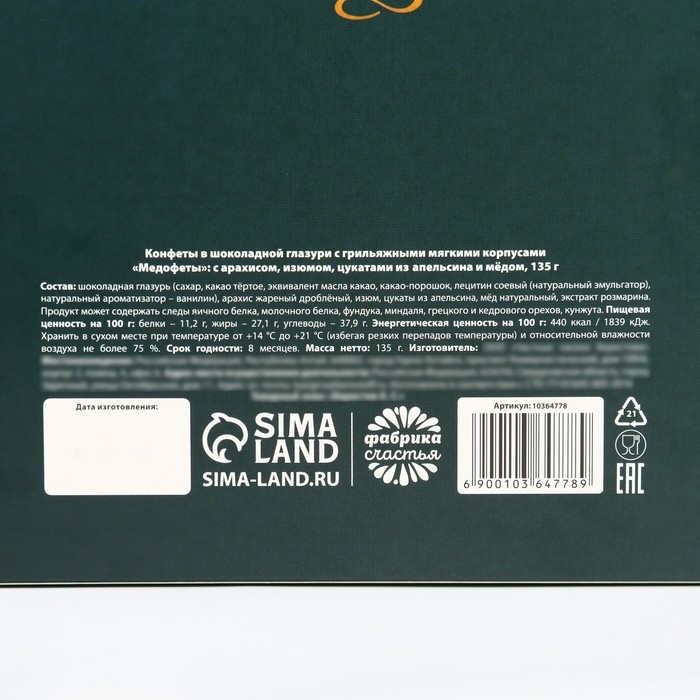 Состав: шоколадная глазурь (сахар, какао тёртое, эквивалент масла какао, какао-порошок, лецитин соевый (натуральный эмульгатор), натуральный ароматизатор – ванилин), арахис жареный дроблёный, изюм, цукаты апельсина, мёд натуральный, экстракт розмарина. Продукт может содержать следы яичного белка, молочного белка, фундука, миндаля, грецкого и кедрового орехов, кунжута.