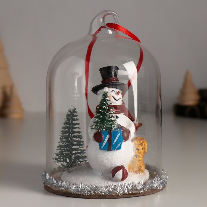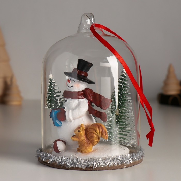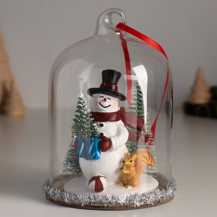 Сувенир полистоун, стекло "Снеговик с ёлкой, белкой и подарками под куполом" 9,5х9,5х12,5 см 10326