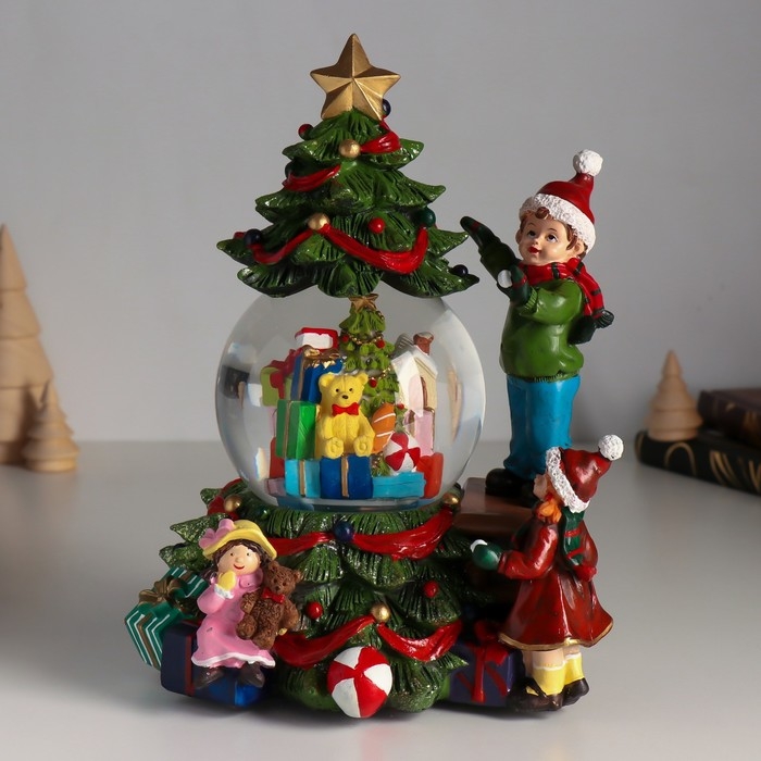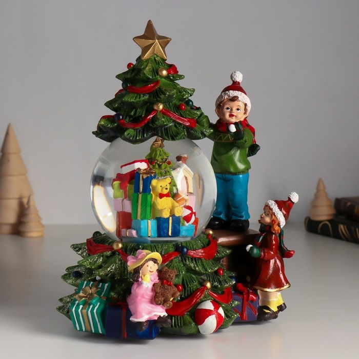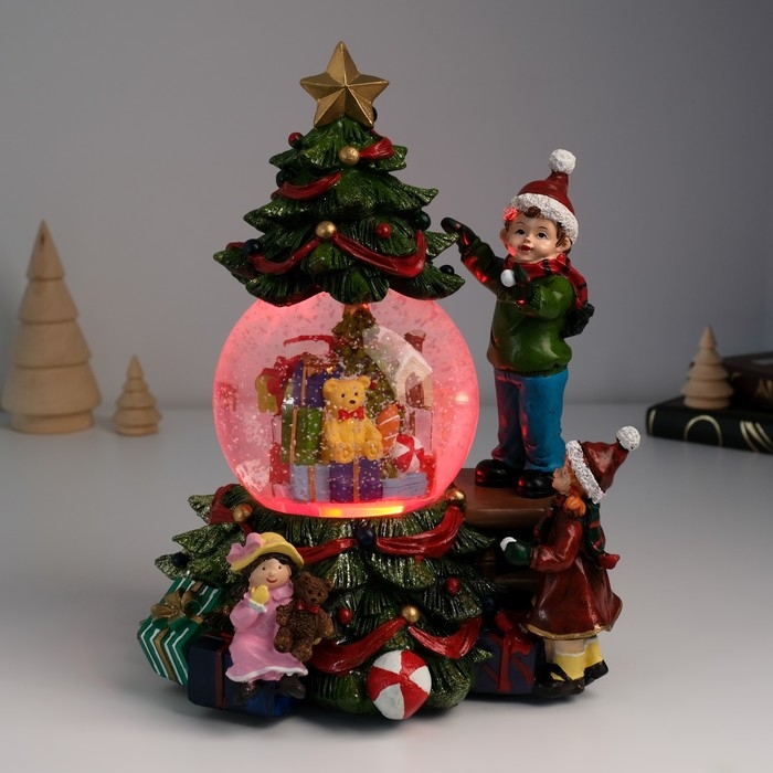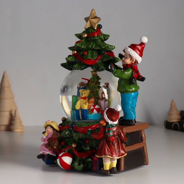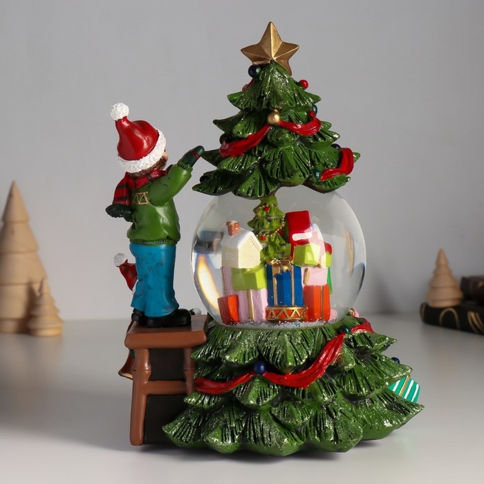 Сувенир полистоун водяной шар музыка, свет "Мальчик наряжает ёлку" d=10 см 18х16х23 см