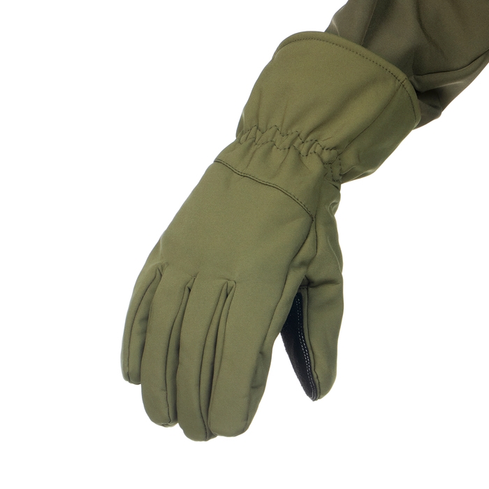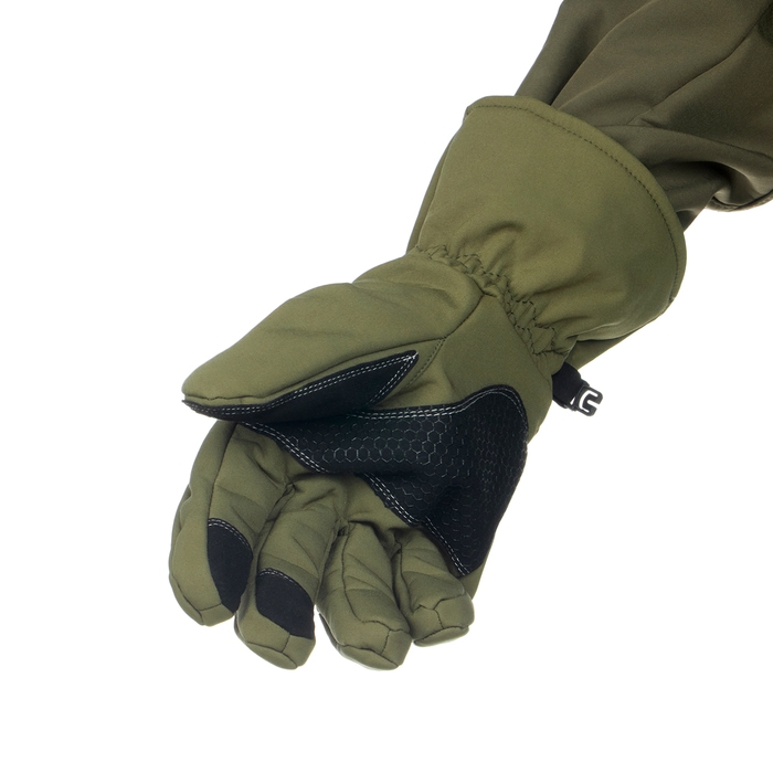 Верхний слой перчаток выполнен из материала софтшелл (Softshell), который широко используется в производстве функциональной одежды для туризма, спорта, охоты и рыбалки. Этот материал сочетает в себе прочность, эластичность, хорошо пропускает воздух и отводит влагу тела, а так же быстро сохнет. Перчатки также оснащены утеплителем из флиса, который сохраняет тепло рук при низких температурах.