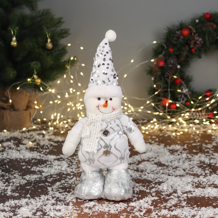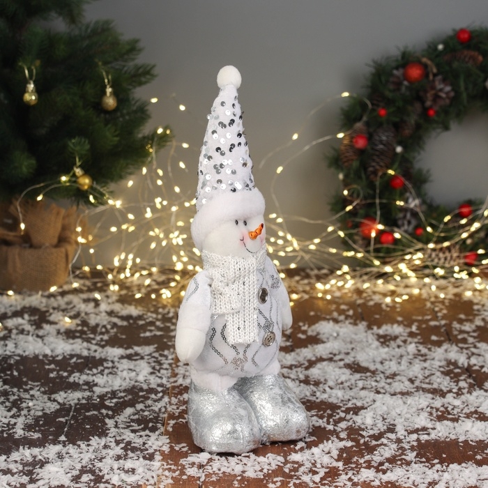 Мягкая игрушка "Снеговик в блестящем колпаке" 38х19 см, серебристо-белый