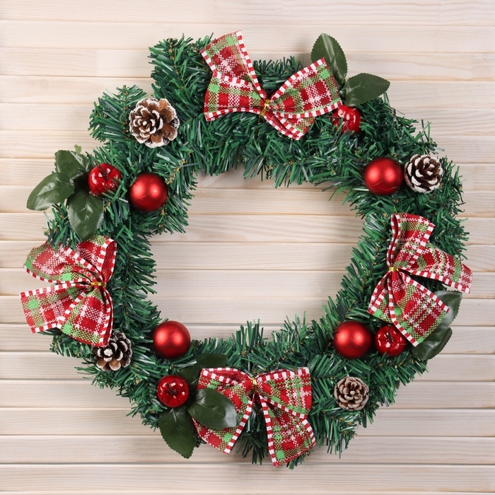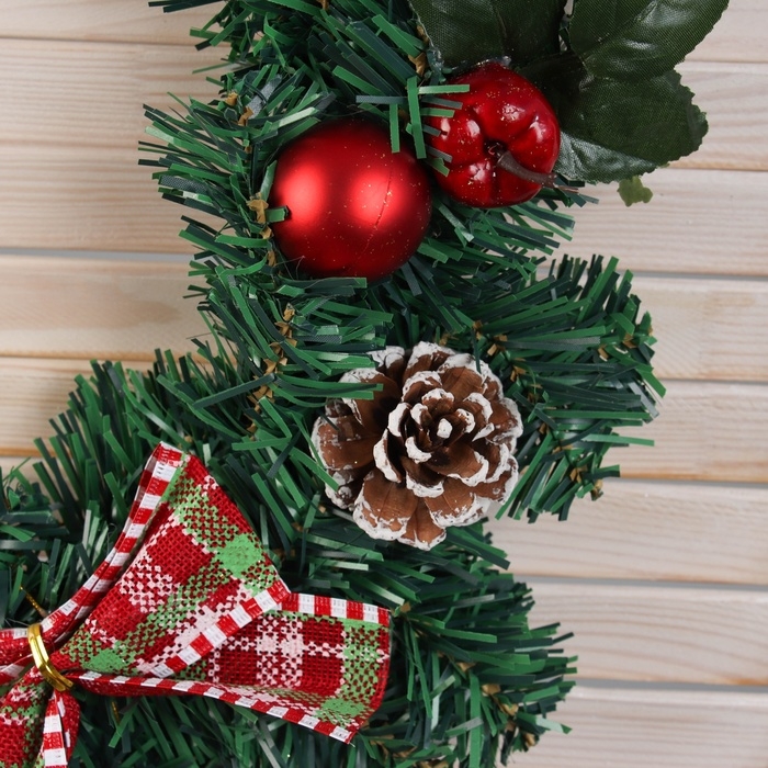Венок новогодний d-40 см "Яркая сказка" листья шишки банты