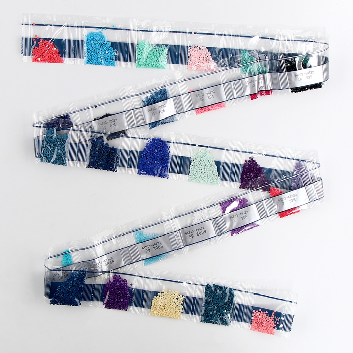 - Из пакетика с номером, который соответствует схеме, отсыпьте в ёмкость немного страз.