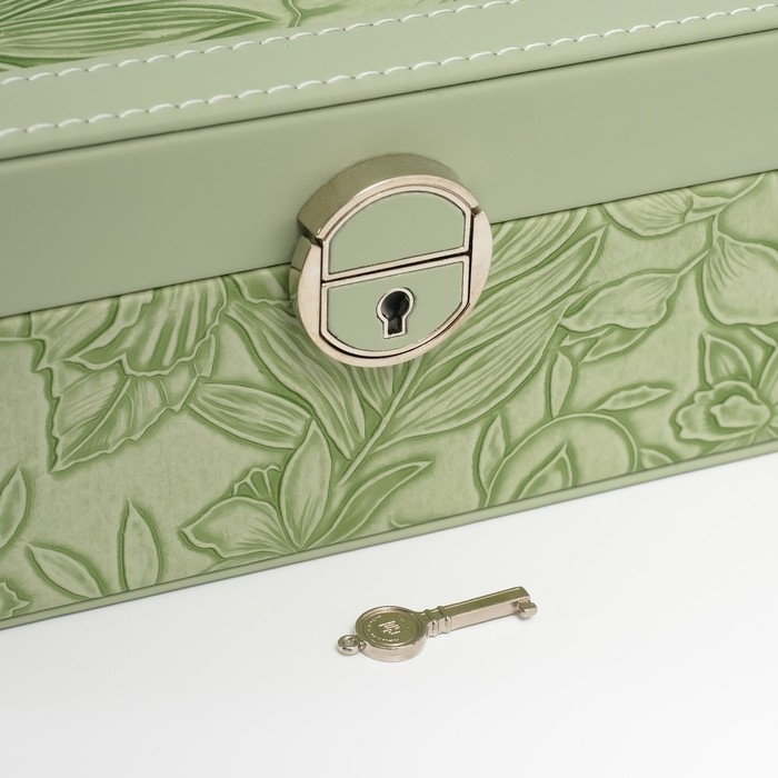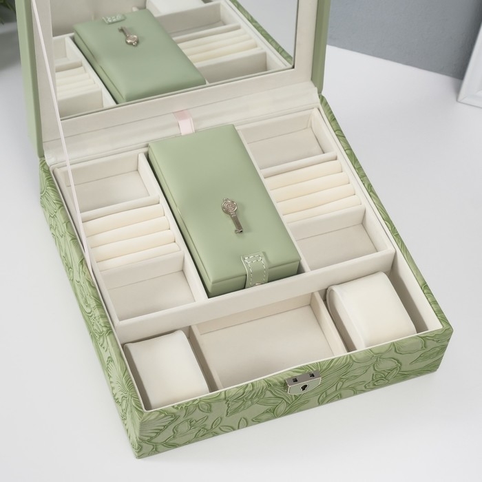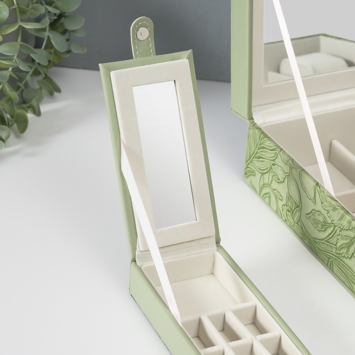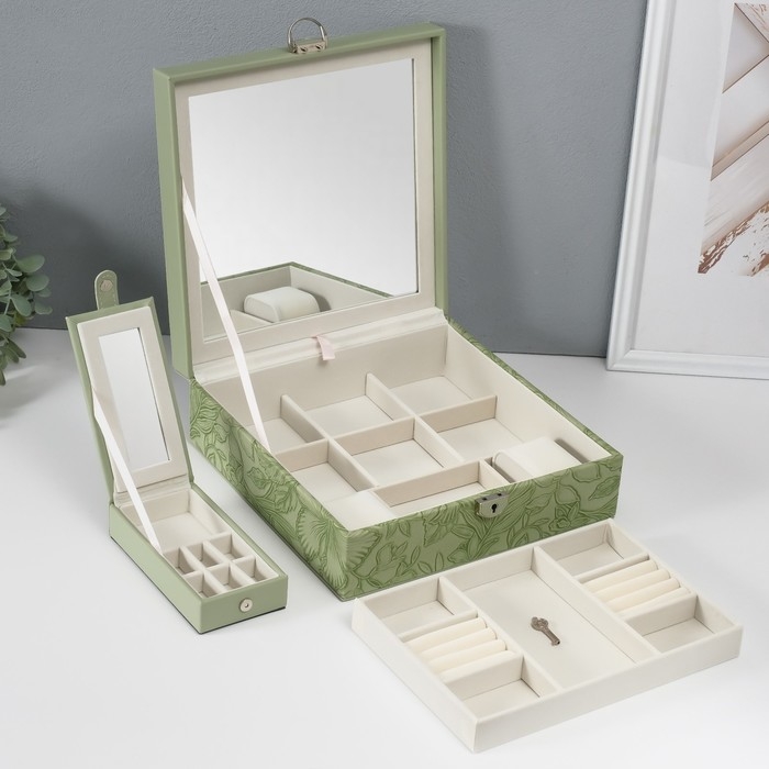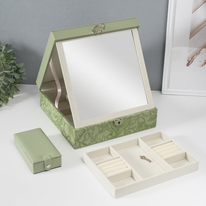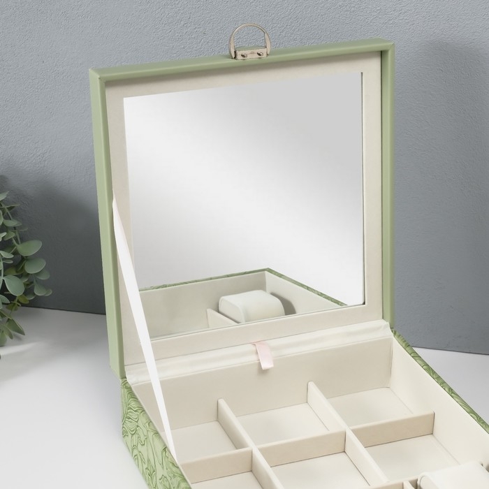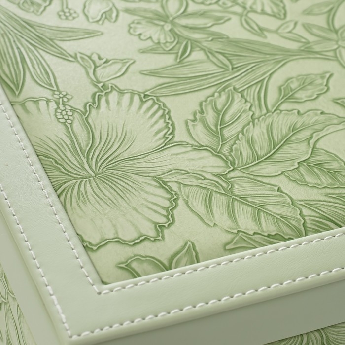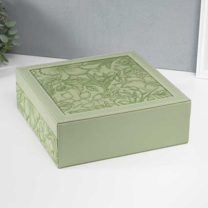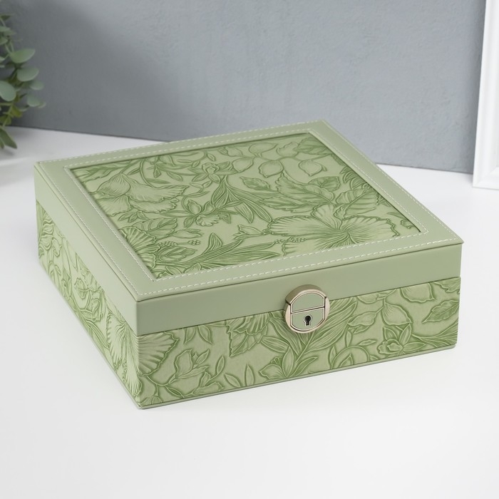 Шкатулка кожзам для украшений "Цветы" тиснение, серо-зелёная 25х25х8 см
