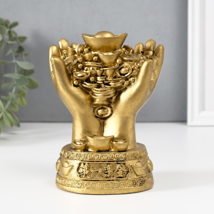 Нэцкэ полистоун под бронзу "Монеты и слитки в ладонях" 7,7х10,7х14 см
