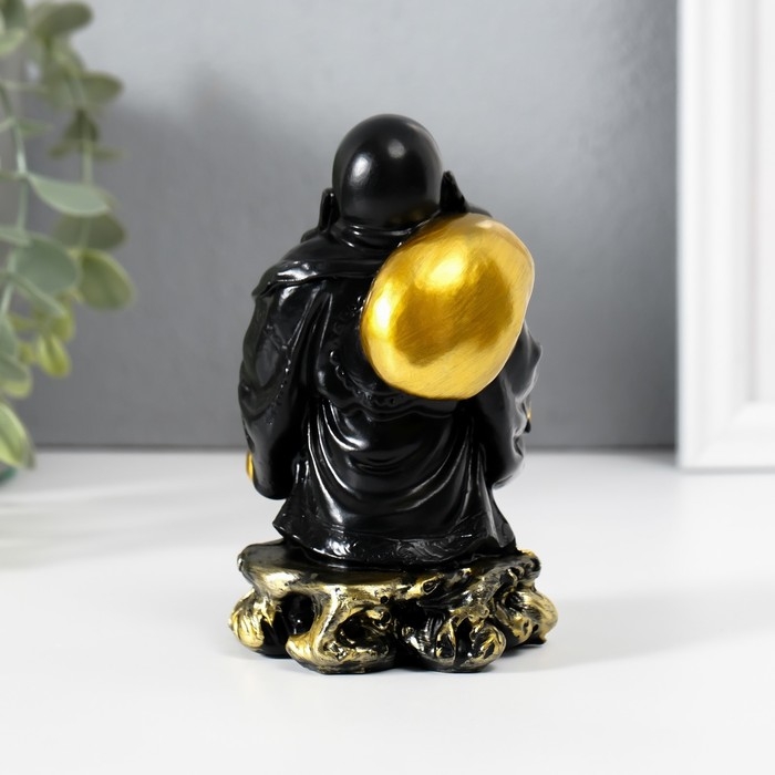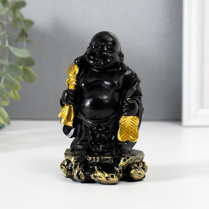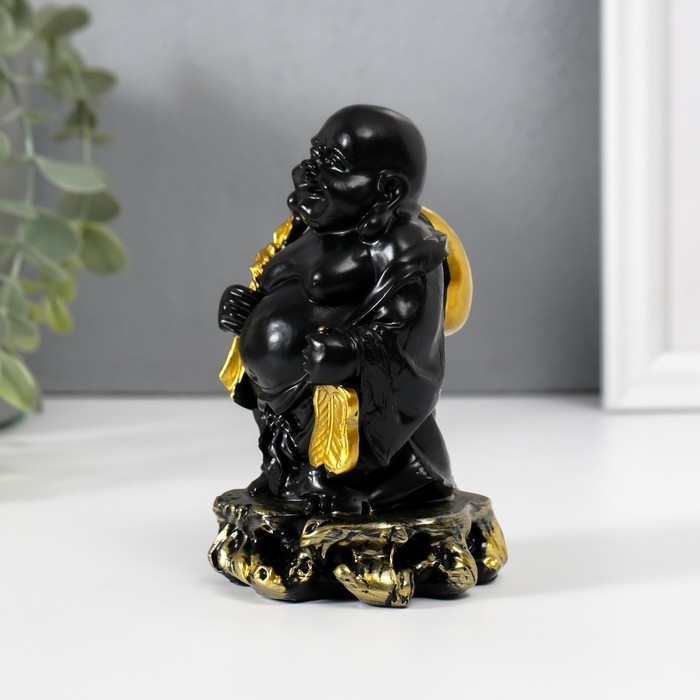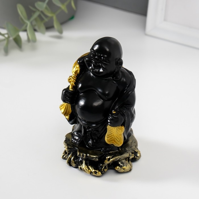 Нэцкэ полистоун "Хотей с золотым мешком и веером" чёрный 6,5х6,7х11,5 см