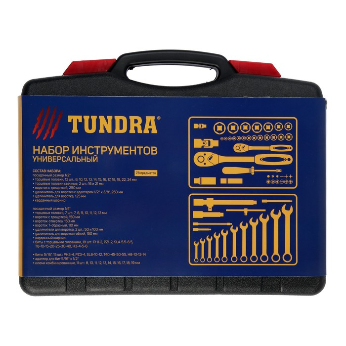Набор инструментов в кейсе ТУНДРА, автомобильный, CrV, 1/2" и 1/4", 78 предметов