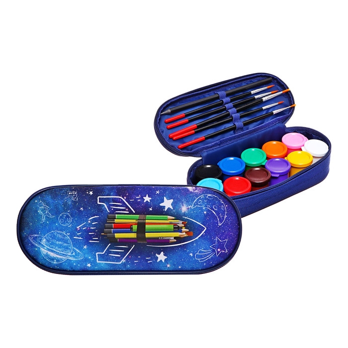 Пенал мягкий, 1 отделение, 95 х 205 х 45 мм, футляр, с наполнением 17 предметов, гуашь 11 цветов, Calligrata "Ракета карандаши"