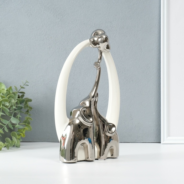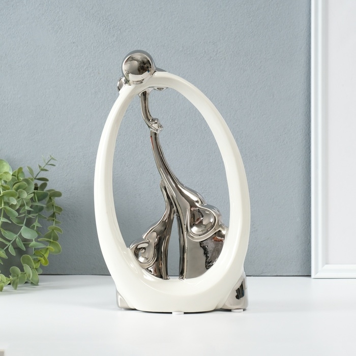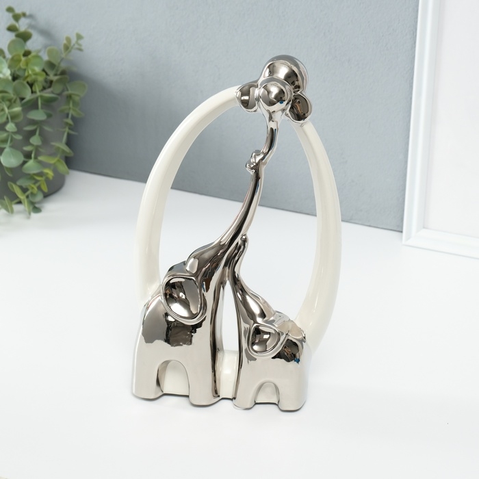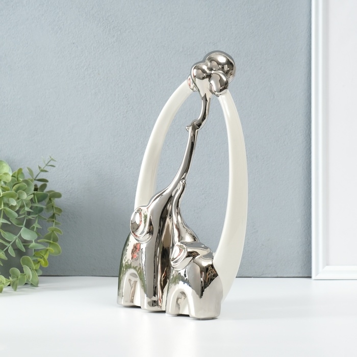 Сувенир керамика "Семья слонов. Овал" белый с серебром 6,5х17х28,5 см