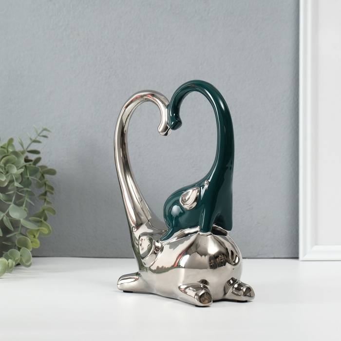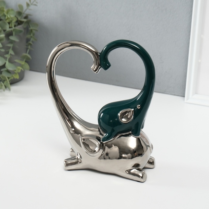 Сувенир керамика "Слон со слонёнком. Сердце" тёмно-зелёный с серебром 7,3х17,5х22 см