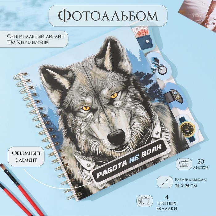 Фотоальбом на спирали 20 листов "Волк" объёмный элемент + 4 вкладки 24х24 см