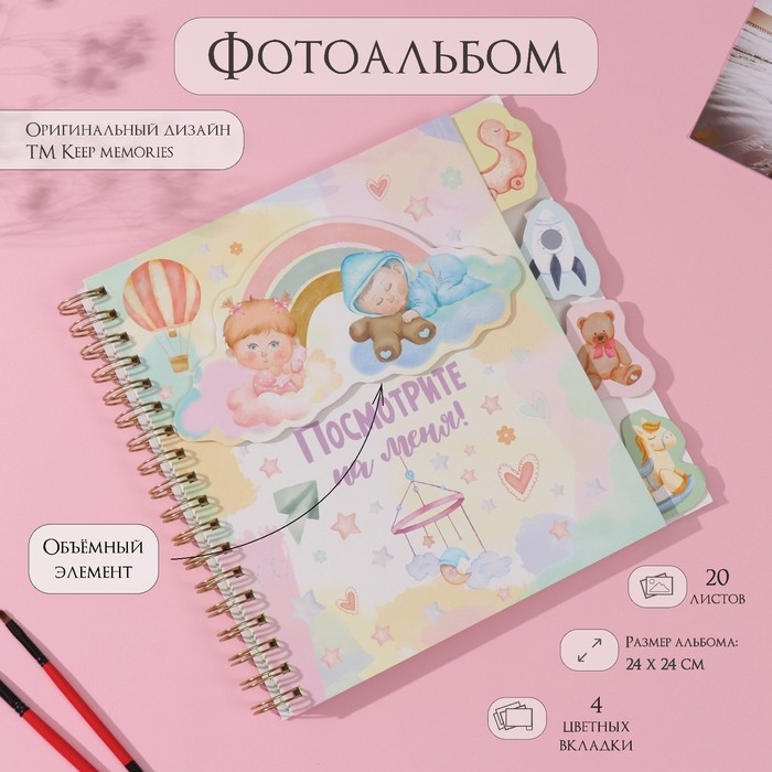 Фотоальбом на спирали 20 листов "Посмотрите на меня!" объёмный элемент + 4 вкладки 24х24 см 104995